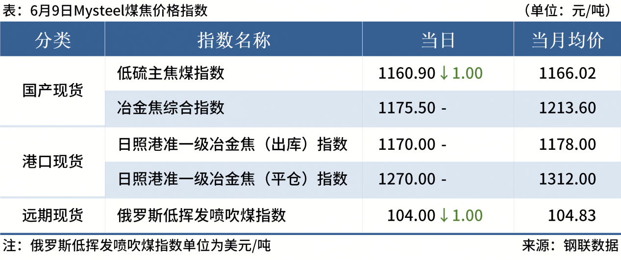 ◎ 6月9日,Mysteel62%鐵礦石指數(shù)94.9,跌0.9,月均95.43;65%鐵礦石指數(shù)104.2,跌0.85,月均104.67。(單位:美元/干噸)