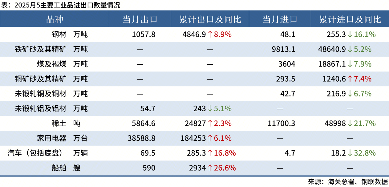◎ 海關總署:2025年5月中國出口鋼材1057.8萬噸,環(huán)比增長1.1%;1-5月累計出口鋼材4846.9萬噸,同比增長8.9%。其他主要產(chǎn)品進出口情況如下: