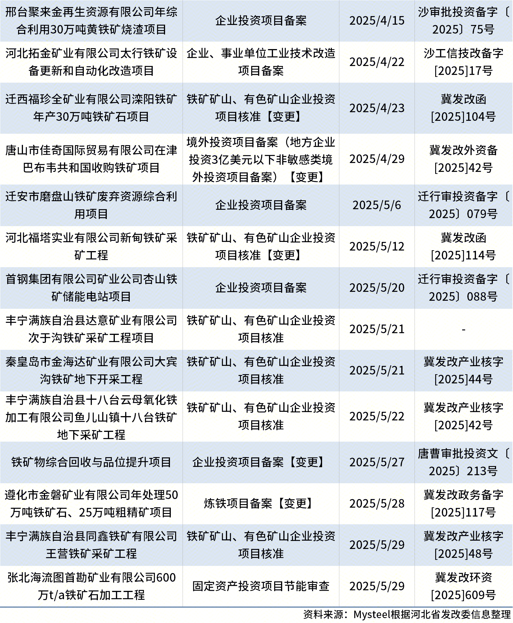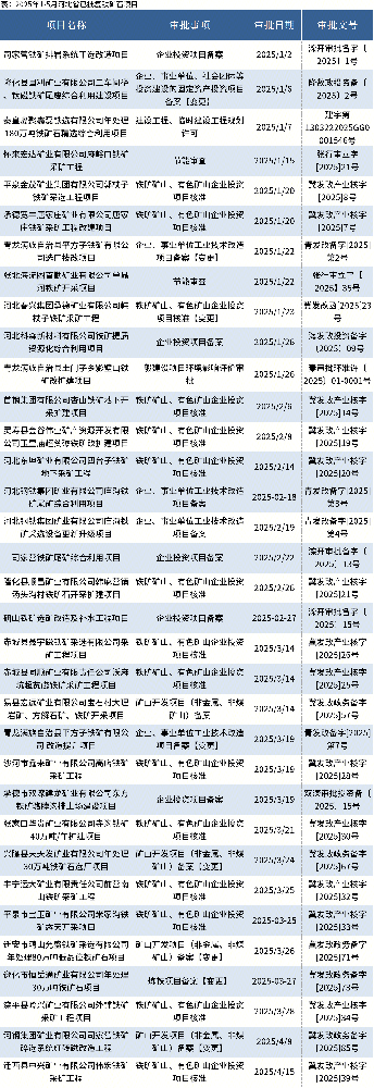 據(jù)Mysteel不完全統(tǒng)計(jì),2025年1-5月河北省共批復(fù)鐵礦石相關(guān)項(xiàng)目48個(gè),分別是21個(gè)鐵礦礦山、有色礦山企業(yè)投資項(xiàng)目核準(zhǔn)或【變更】、9個(gè)企業(yè)投資項(xiàng)目備案或【變更】、2個(gè)節(jié)能審查、4個(gè)礦山開(kāi)發(fā)項(xiàng)目(非金屬、非煤礦山)備案或【變更】、2個(gè)煉鐵項(xiàng)目備案【變更】、5個(gè)企業(yè)、事業(yè)單位工業(yè)技術(shù)改造項(xiàng)目備案或【變更】、1個(gè)境外投資項(xiàng)目備案(地方企業(yè)投資3億美元以下非敏感類(lèi)境外投資項(xiàng)目備案)【變更】、1個(gè)建設(shè)工程、臨時(shí)建設(shè)工程規(guī)劃許可、1個(gè)企業(yè)投資項(xiàng)目備案、1個(gè)一般建設(shè)項(xiàng)目環(huán)境影響評(píng)價(jià)審批和1個(gè)固定資產(chǎn)投資項(xiàng)目節(jié)能審查。