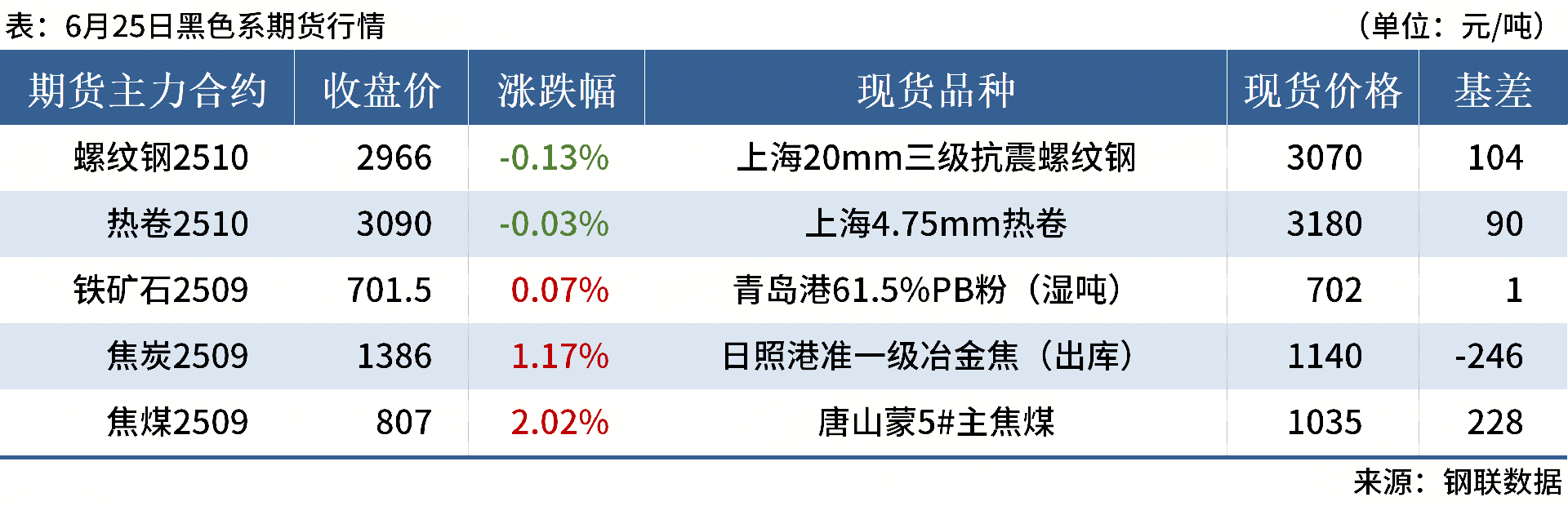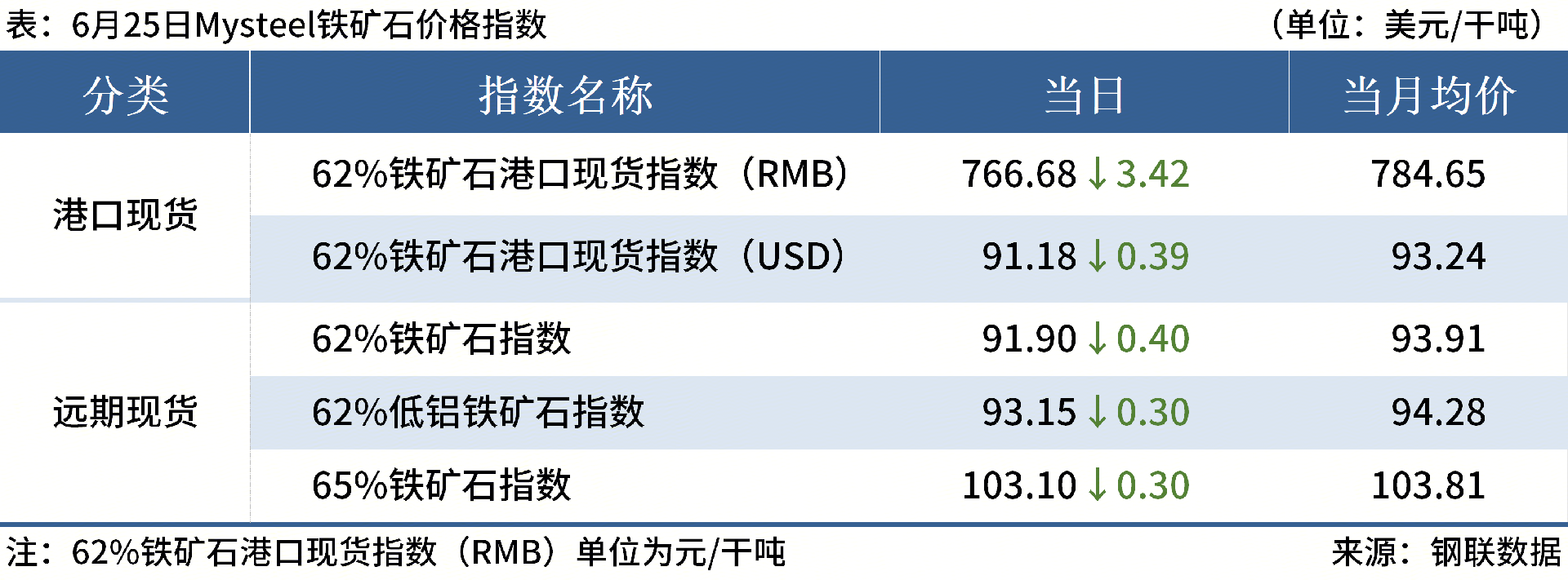 ◎ 6月25日,全國主港鐵礦石成交107.70萬噸,環(huán)比增32.5%;237家主流貿(mào)易商建筑鋼材成交9.35萬噸,環(huán)比增0.3%。