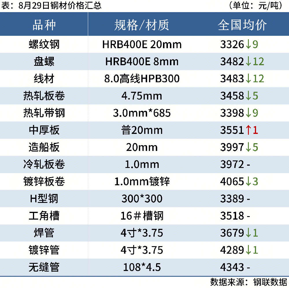 螺紋鋼:8月29日,全國31個(gè)主要城市20mm三級(jí)抗震螺紋鋼均價(jià)3326元/噸,較上個(gè)交易日跌9元/噸。短期來看,供需基本面矛盾逐步累加,預(yù)計(jì)下周國內(nèi)建筑鋼材價(jià)格或?qū)⒀永m(xù)偏弱震蕩運(yùn)行態(tài)勢。
